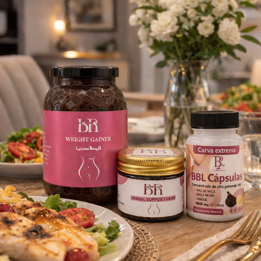 Este pack combina 3 productos que trabajan juntos para ayudar a potenciar las curvas femeninas de forma natural: Lahsa Sahrawiya + Supositorios herbales + Cápsulas BBL.